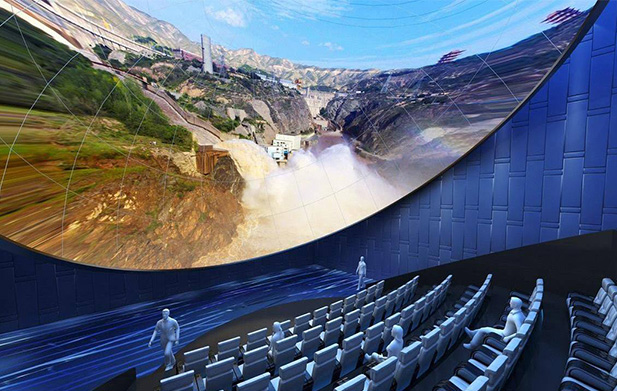 穹頂式球幕投影打破了以往投影圖像只能是平面規(guī)則圖形的局限,利用特殊的光學(xué)鏡頭,將普通的平面影像進(jìn)行特殊的變換,投射到一個球形的屏幕內(nèi),形成一個內(nèi)投的球體影像。