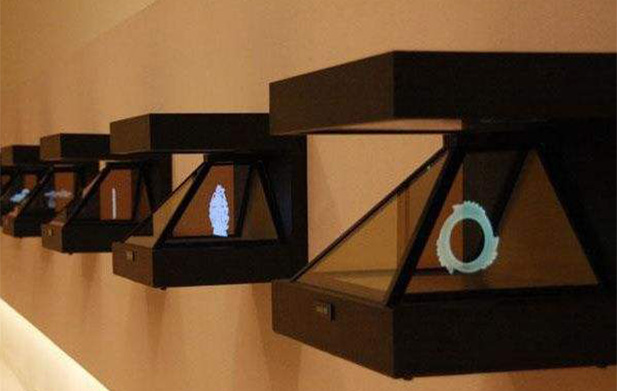 70度全息成像系統(tǒng)是當今流行的展覽設(shè)備。它結(jié)合了實體模型,利用鍍膜玻璃的折射和反射原理,將虛像投射到成像空間。通過三個微調(diào)表面的投影和融合,形成一個真實的圖像內(nèi)容,給人一種真實的“物體在其中”的感覺。