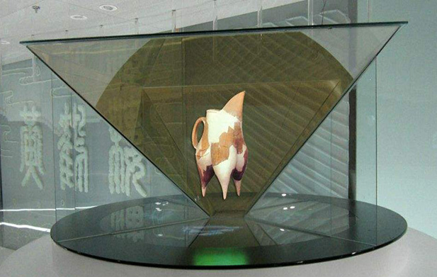 全息展示柜主要由柜體、分光鏡、聚光燈和視頻播放設備組成。通過特殊的處理技術,構建真實產品圖像的三維模型,然后疊加到場景中,將真實物體與圖像結合起來,形成一個產品展示系統。